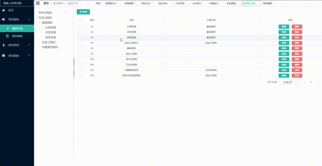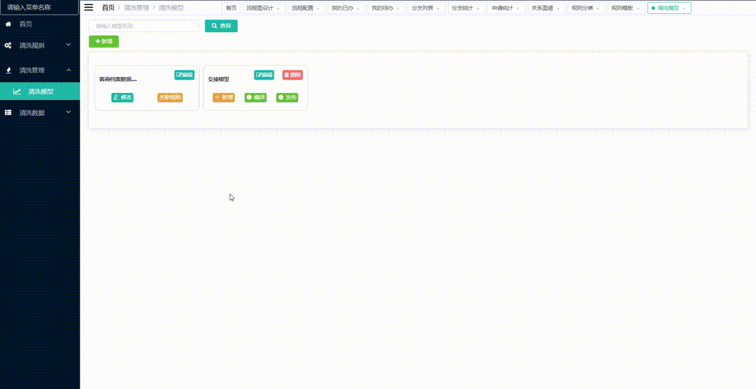 清洗管理中,对需要清洗的模型进行了定义,在模型实体中,对每个清洗的元数据字段进行了清洗规则的绑定,制定出一套规范化,智能化的清洗模型。